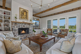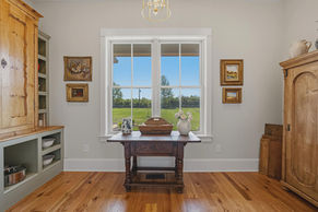 Blue Sky Farm was completed in 2023 as the personal residence of an established custom builder, and every specification reflects that singular standard. The residence is sited to harness the full drama of its natural setting — every principal room frames a living tableau of the pond, the long light of evening, and the silhouette of the Blue Ridge Mountains beyond. All four bedrooms occupy the main floor, arranged for both quiet separation and effortless daily flow. The lower level adds approx. 1,034 finished sq. ft. with a full bathroom, plus approx. 2,420 sq. ft. unfinished and ready for a future media room, gym, guest suite, or additional bedrooms. Total finished area is approx. 4,701 sq. ft.; total under roof, including outbuildings, is approx. 14,875 sq. ft. The grounds extend across approx. 15.33 acres on two parcels, encompassing a pond, commercial-scale perennial gardens, and the restored Blue Sky Barn.