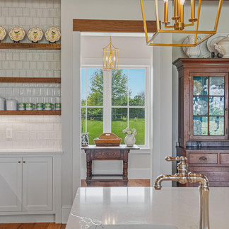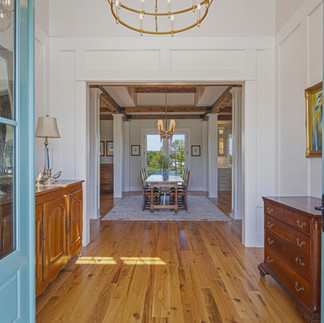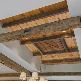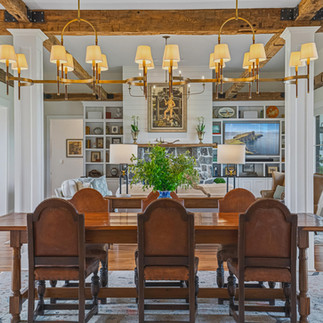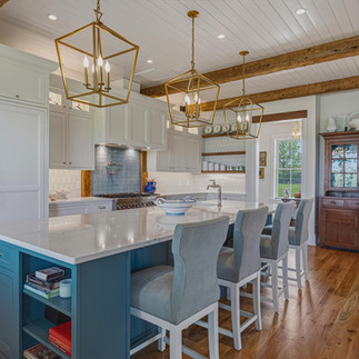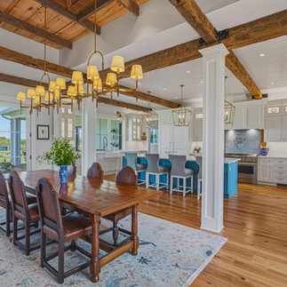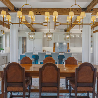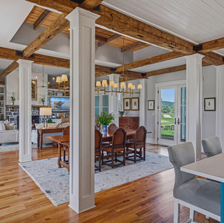 Inside, the materials catalog reads like a builder's personal wish list. Showplace custom cabinetry with Kohler polished nickel hardware. Cambria premium quartz countertops, the kitchen island poured as a single seamless slab. A full JennAir appliance suite. Visual Comfort and Hinkley decorative fixtures, joined by 82 LED recessed lighting positions for layered illumination throughout the day. Random-width rustic red oak flooring sanded and finished in place. A masonry fireplace anchored by a Loudoun County fieldstone hearth and a barn-beam mantle, the architectural detail that ties the modern construction back to the agricultural heritage of the land.