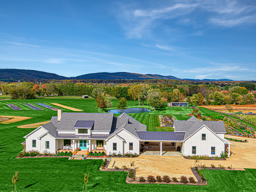 From a few hundred feet up, the geometry of the place becomes legible. The 2023 modern farmhouse anchors the southern edge of the clearing, its long rooflines and standing-seam metal accents drawing the eye eastward toward the restored 1950 dairy barn that gives the property its character and its name. Between them lies a pond, sited to mirror the late afternoon sky and the long blue line of the Blue Ridge beyond. To one side of the residence, beds of perennials run in long ordered rows — commercial-scale plantings organized for color and fragrance from the first crocus to the last asters of October. To the other side, the approx. 15.33 acres open into pasture and a vacant second parcel that adjoins the working core of the farm.